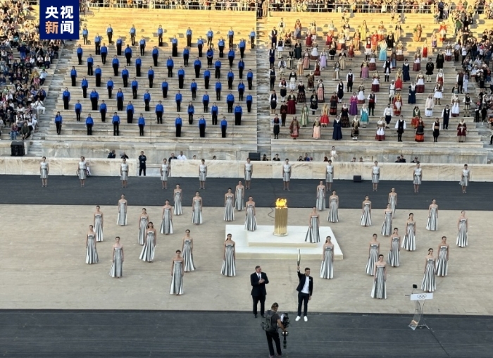 当地时间4月26日,在巴黎奥运会火种交接仪式现场,希腊奥委会主席卡普拉洛斯将火种交给巴黎奥组委主席埃斯坦盖。