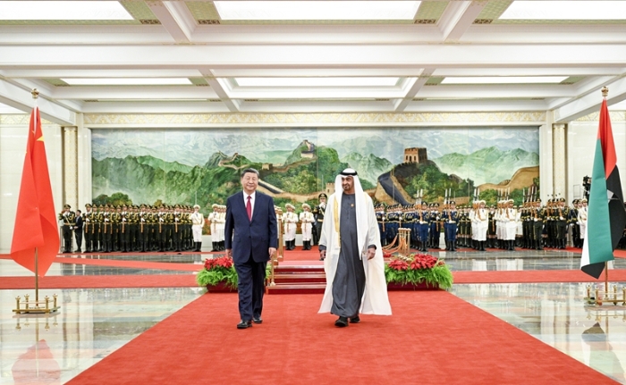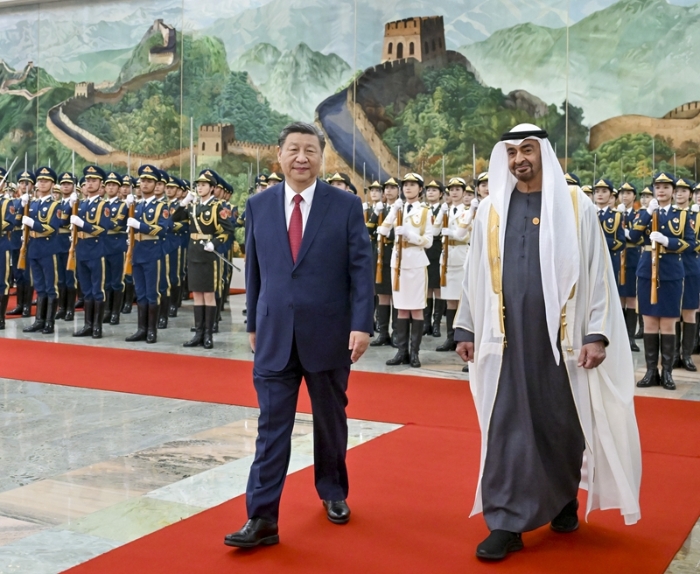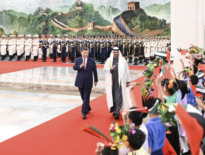 5月30日下午,国家主席习近平在北京人民大会堂同来华国事访问并出席中国-阿拉伯国家合作论坛第十届部长级会议开幕式的阿联酋总统穆罕默德举行会谈。这是会谈前,习近平在人民大会堂北大厅为穆罕默德举行欢迎仪式。新华社记者 饶爱民 摄