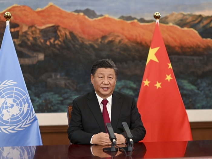2021年10月12日,习近平主席以视频方式出席《生物多样性公约》第十五次缔约方大会领导人峰会并发表主旨讲话。新华社记者 李学仁 摄