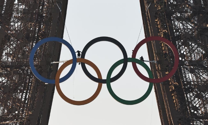 ↑6月7日在法国巴黎拍摄的正在悬挂奥运五环标志的埃菲尔铁塔。