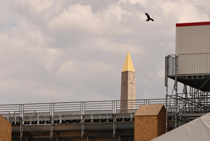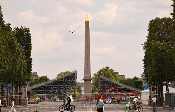 ↑6月4日在位于法国巴黎市中心的协和广场拍摄的临时比赛场地搭建现场。