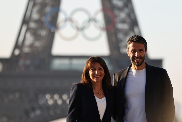 ↑6月7日,巴黎奥组委主席托尼·埃斯坦盖(右)和巴黎市长伊达尔戈与悬挂奥运五环标志的埃菲尔铁塔合影留念。