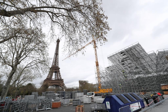 ↑4月2日在埃菲尔铁塔附近战神广场拍摄的奥运比赛场地和看台建设现场。