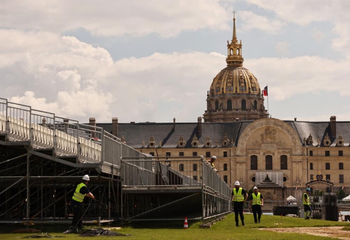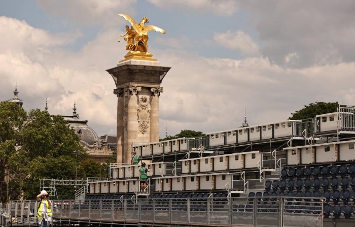 ↑6月4日在位于巴黎市中心的亚历山大三世桥拍摄的临时比赛场地搭建现场。