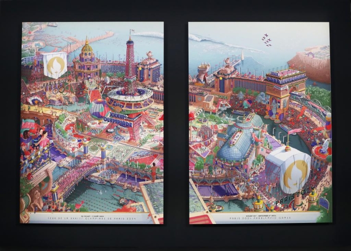 ↑3月4日在巴黎奥赛博物馆拍摄的巴黎奥运会官方海报(左)和残奥会官方海报。