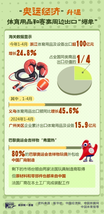 巴黎奥运会的临近让“奥运经济”持续升温。国内多地海关数据显示,在巴黎奥运会的助推下,中国体育用品和赛事周边产品出口大幅增长。