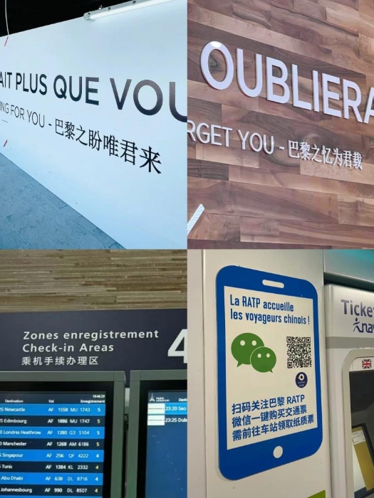 巴黎戴高乐机场的中文标识以及地铁站里的微信购票广告