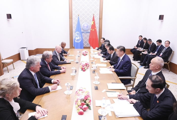 当地时间7月4日下午,国家主席习近平在阿斯塔纳出席上海合作组织峰会期间会见联合国秘书长古特雷斯。新华社记者 庞兴雷 摄