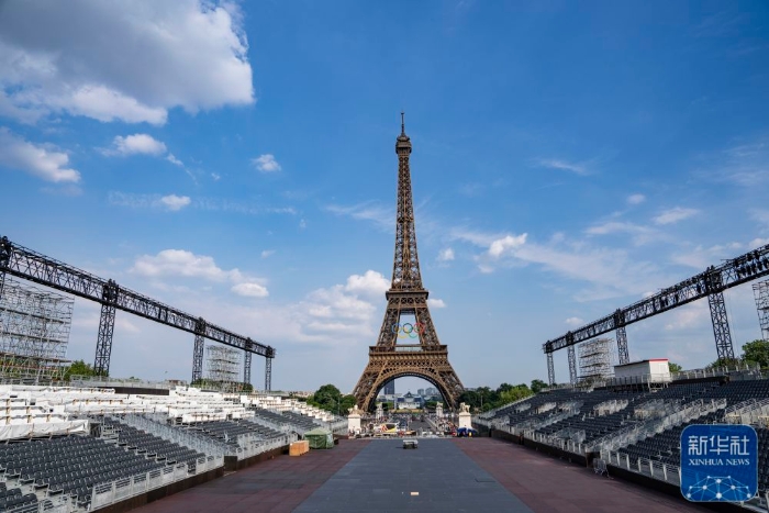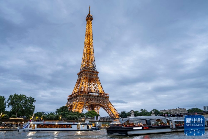 塞纳河畔的埃菲尔铁塔,已经装饰上奥运五环标识(7月3日摄)。新华社记者 孙非 摄