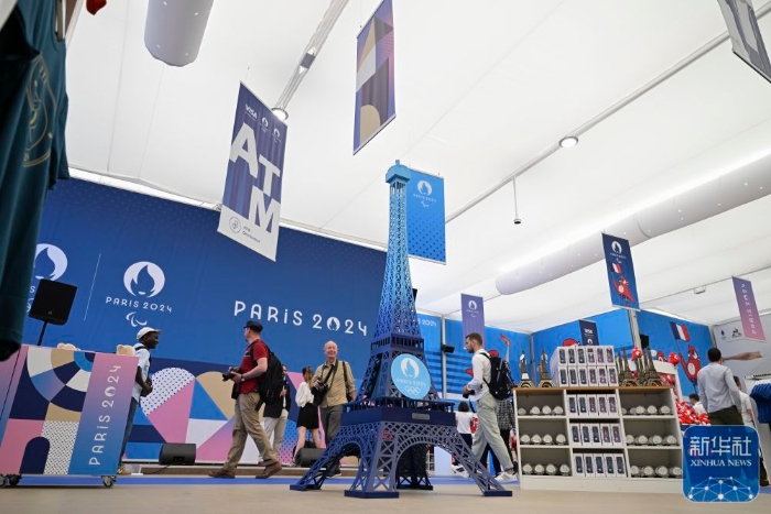 在巴黎香榭丽舍大道的巴黎奥运会官方特许商品旗舰店,顾客们正在选购商品(6月27日摄)。新华社记者 贺长山 摄
