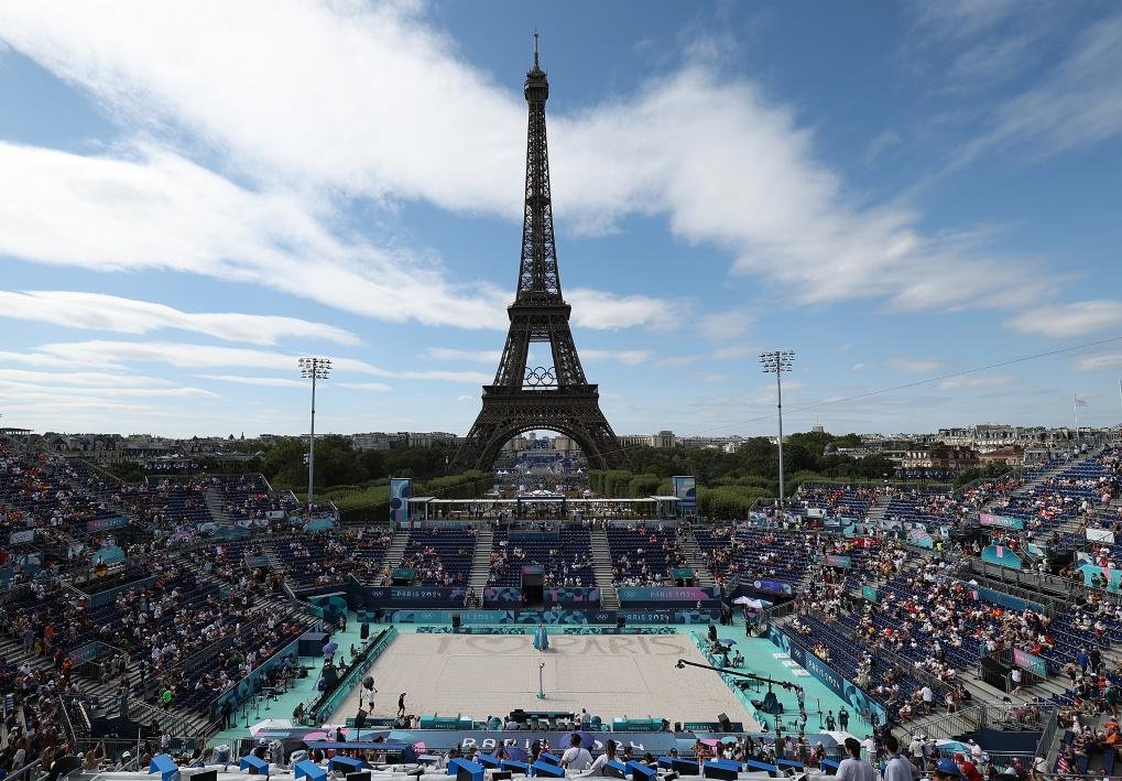 8月8日拍摄的位于埃菲尔铁塔旁的沙滩排球赛场。新华社记者 黄宗治 摄