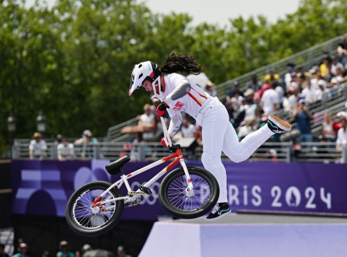 中国选手邓雅文在巴黎奥运会自由式小轮车女子公园赛决赛中获得冠军(2024年7月31日摄)。新华社记者 胡虎虎 摄