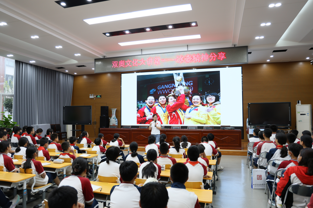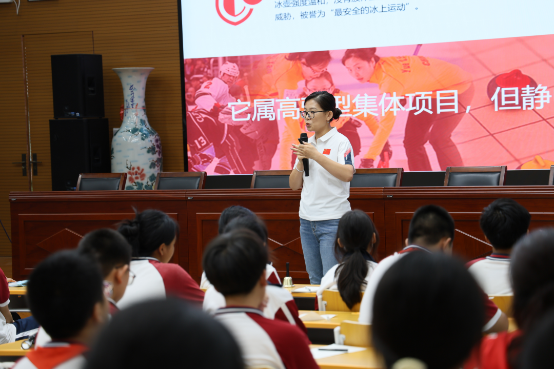 9月9日,第十五届北京奥运城市体育文化节双奥文化推广项目之“双奥文化大讲堂”系列活动拉开帷幕,首场互动讲座在石景山区古城中学开讲。中国女子冰壶队前队长、现任北京体育大学中国雪上运动学院教师王冰玉来到古城中学,为同学们带来了一场关于冬奥赛事项目冰壶运动的深入讲解。她不仅分享了冰壶的历史和赛制规则,还讲述了中国冰壶队的奋斗故事,激励同学们以双奥城市为新起点,了解更多冬奥知识,爱上冰雪运动,锻炼身心强健体魄,以实际行动传承和发扬奥林匹克精神。