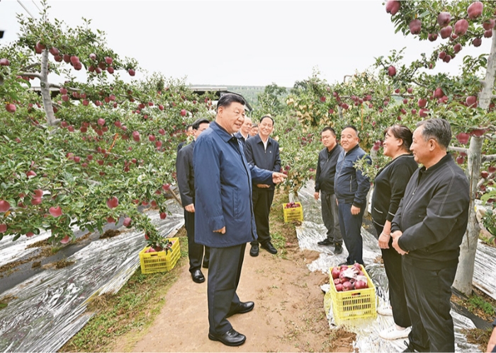 2024年9月10日至13日,中共中央总书记、国家主席、中央军委主席习近平在甘肃考察。这是11日上午,习近平在天水市麦积区南山花牛苹果基地考察时,走进果林了解相关种植、技术和管理情况。新华社记者 谢环驰/摄