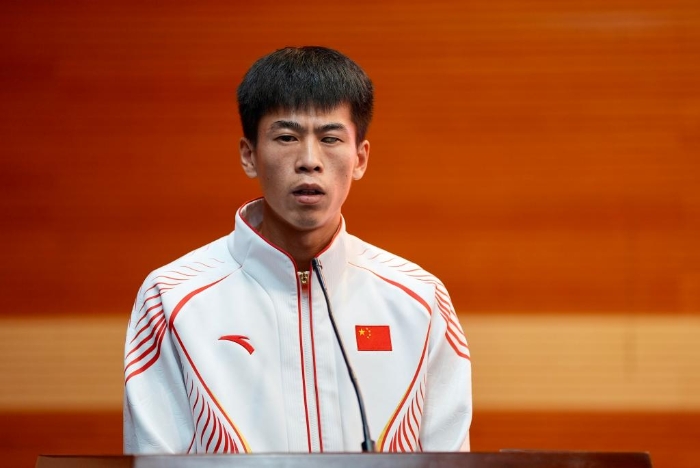 9月20日,运动员代表邸东东在第17届夏季残奥会中国体育代表团总结大会上发言。新华社发(中国残联供图 王鹏摄)