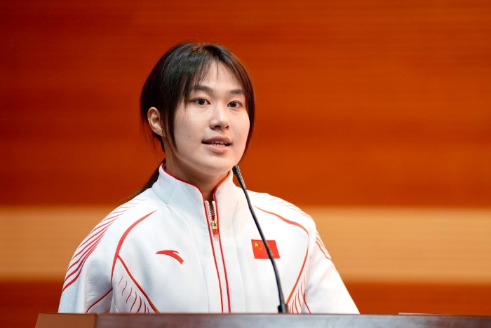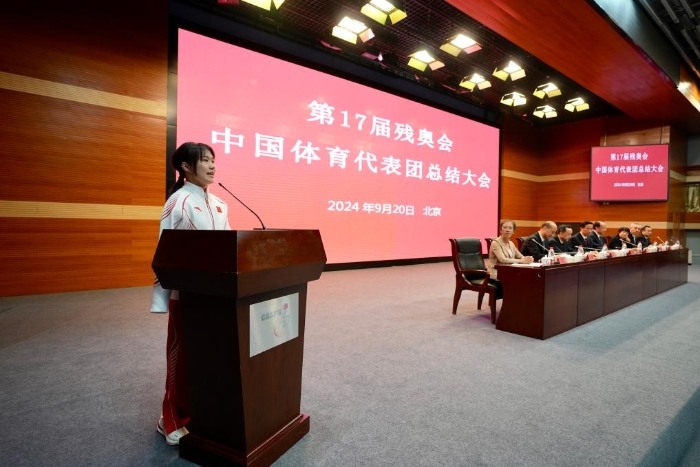 9月20日,运动员代表蒋裕燕在第17届夏季残奥会中国体育代表团总结大会上发言。新华社发(中国残联供图 王鹏摄)