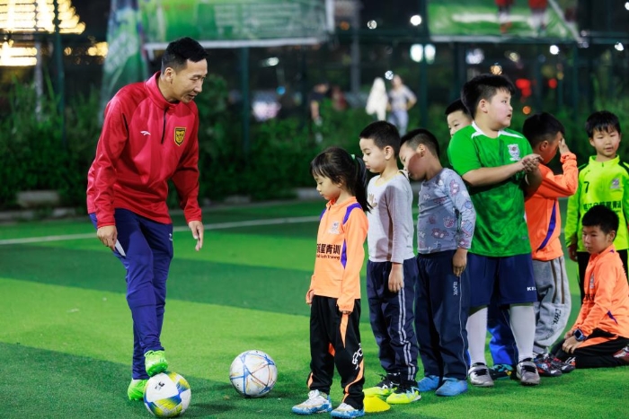 4月8日,董永恒(左一)在对榕江县的小球员进行培训。新华社记者 刘续 摄