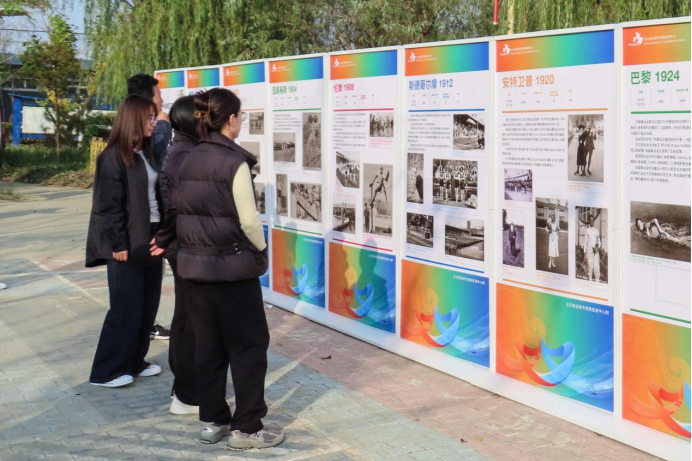 展览以时间轴为线索,展现了自1896年首届现代奥运会以来,历届夏季奥运会的独特故事和里程碑事件。展览中的图片大部分都是首次在国内亮相的珍贵史料,丰富而精彩的图文内容让参观者仿佛穿越时空,充分领略到了奥运盛会百余年历程。其中中国健儿们的夺金时刻,也是最让村民们反复回味的画面——从1984年洛杉矶奥运会上许海峰射落的第一枚奥运金牌,到2008年北京奥运会上中国代表团位居金牌榜第一,再到2024年巴黎奥运会上中国运动员创下海外参加奥运会最佳战绩,每一幅照片都讲述着中国体育的崛起和荣耀,让大家重温了那些激动人心的瞬间。