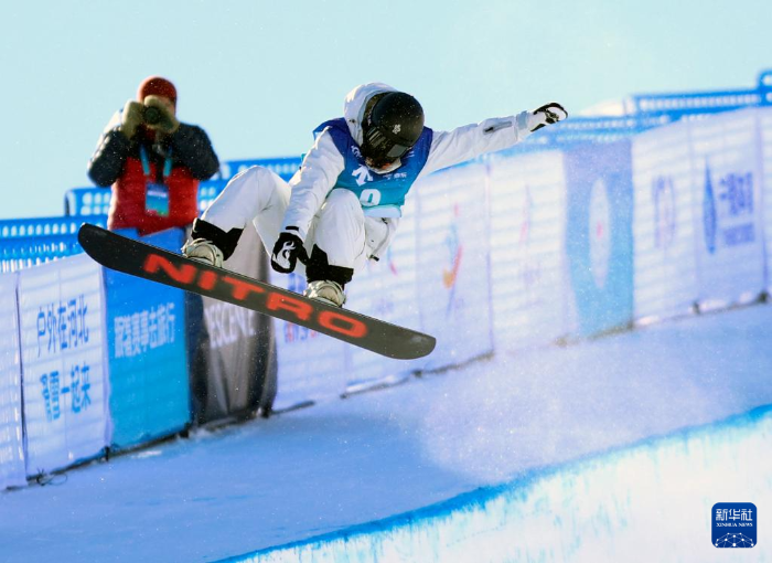 12月8日,2024-2025赛季国际雪联单板滑雪U型场地技巧世界杯崇礼站女子组决赛在河北张家口崇礼云顶滑雪公园举行,中国选手蔡雪桐获得亚军。新华社记者 雒圆 摄
