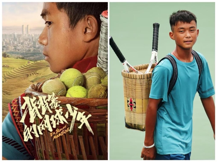《背背篓的网球少年》海报及其原型人物王发(右)