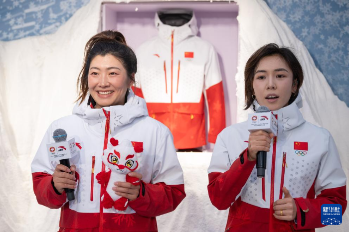 1月9日,徐梦桃(左)和阿合娜尔·阿达克在发布现场。新华社记者 张涛 摄