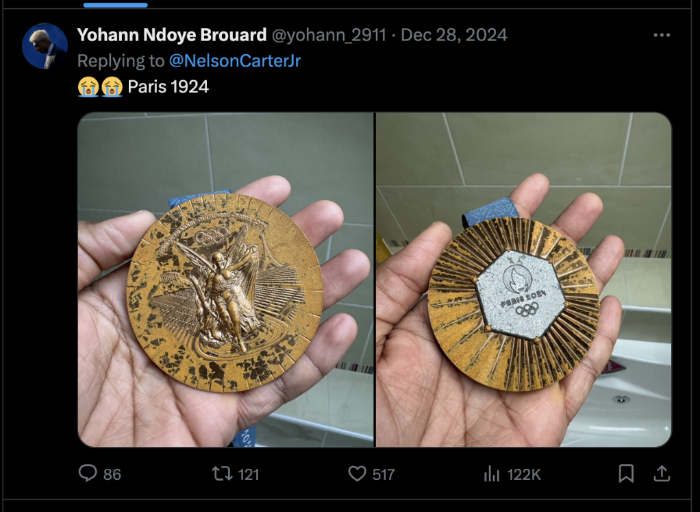 事实上,早在去年奥运会比赛期间,美国滑板运动员尼亚·休斯顿就表示,自己刚刚获得的奖牌在仅仅10天后就出现表面光泽变暗淡和涂层剥落等问题,他在社交媒体上直言“奥运会奖牌质量需要大幅度提高”。