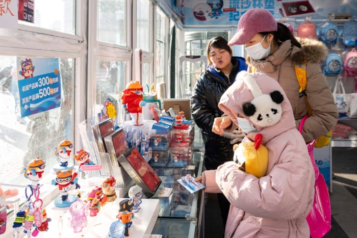 1月8日,游客在哈尔滨一家亚冬会特许商品零售店里挑选文创产品。新华社记者 谢剑飞 摄