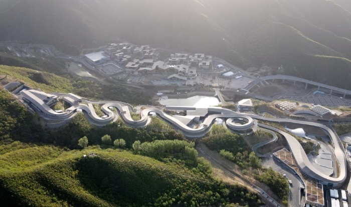 国家雪车雪橇中心(下)和冬奥村(上)(无人机照片)。新华社记者 张晨霖 摄