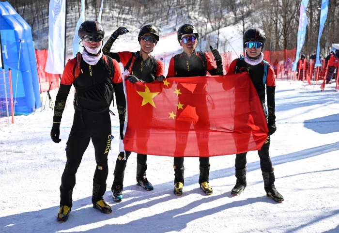 2月9日,第九届亚冬会滑雪登山男子短距离决赛在亚布力举行。图为包揽前四名的中国队选手在决赛后合影。新华社记者 谢剑飞 摄
