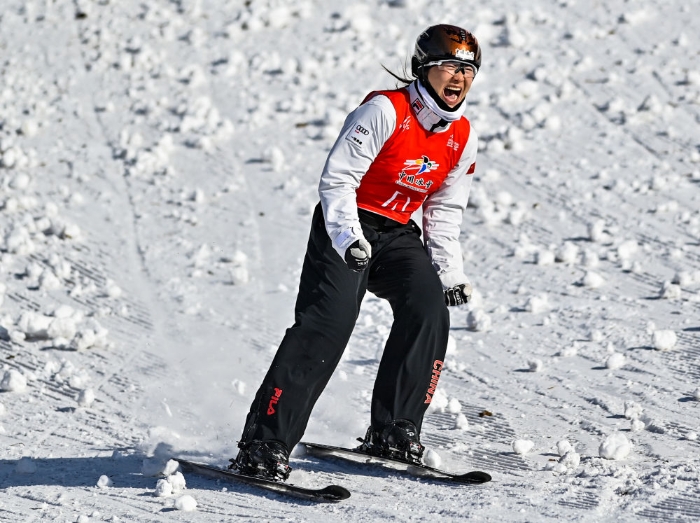 2月23日,中国选手徐梦桃夺冠后庆祝。新华社记者 颜麟蕴 摄