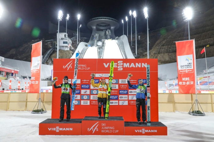 2024年12月15日,2024-2025赛季国际雪联跳台滑雪世界杯女子个人标准台决赛在张家口崇礼国家跳台滑雪中心“雪如意”举行。冠军德国选手卡塔琳娜·施密德(中)、亚军斯洛文尼亚选手埃玛·克莱内茨(左)和季军奥地利选手莉萨·埃德在颁奖台上庆祝。新华社发(武殿森摄)