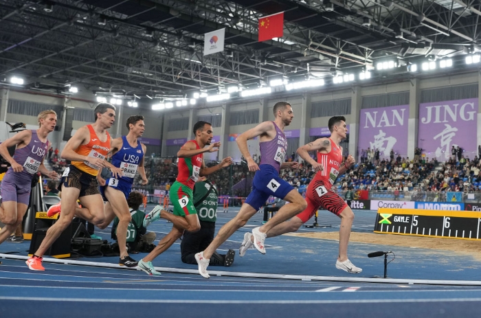3月23日,挪威选手因格布里格森(右一)在决赛中。最终他获得冠军。当日,2025南京世界田联室内锦标赛男子1500米决赛举行。新华社记者 李博 摄