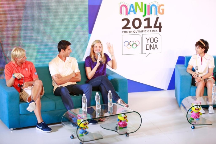 2014年8月25日,考文垂(右二)在南京青奥会“与冠军对话”活动中发言。 新华社记者任正来摄