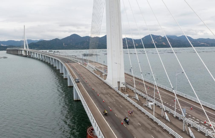 2月23日,运动员跑在深圳湾大桥上(无人机照片)。当日,2025深港马拉松赛暨第十五届全国运动会田径(马拉松)测试赛开跑。新华社记者 毛思倩 摄