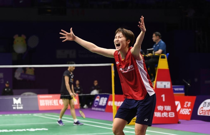2023年5月21日,中国队选手陈雨菲在女单比赛后庆祝胜利。当日,在江苏苏州举行的2023年苏迪曼杯世界羽毛球混合团体锦标赛决赛中,中国队以3比0战胜韩国队,夺得冠军。新华社记者 侯昭康 摄