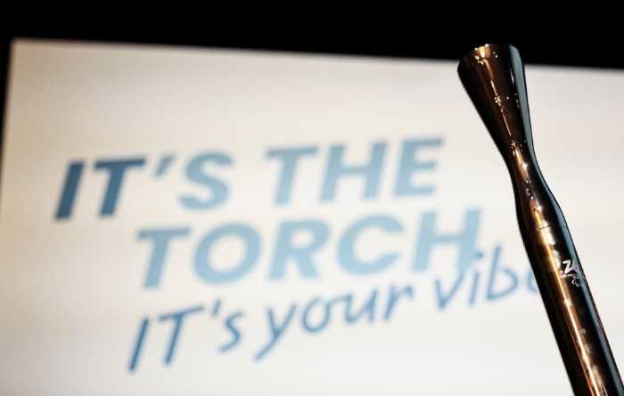 图为4月14日在米兰发布活动现场拍摄的2026年米兰-科尔蒂纳丹佩佐冬残奥会火炬。新华社记者 李京 摄