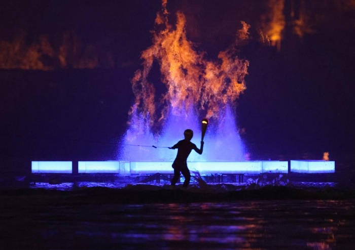 此次开幕式进行了世运会历史上第一次主火炬点燃仪式,主创团队经过多轮研讨,采取火在喷泉中燃烧作为主要创意点,通过精心设计,让天然气向上穿过水柱,实现节能燃烧。