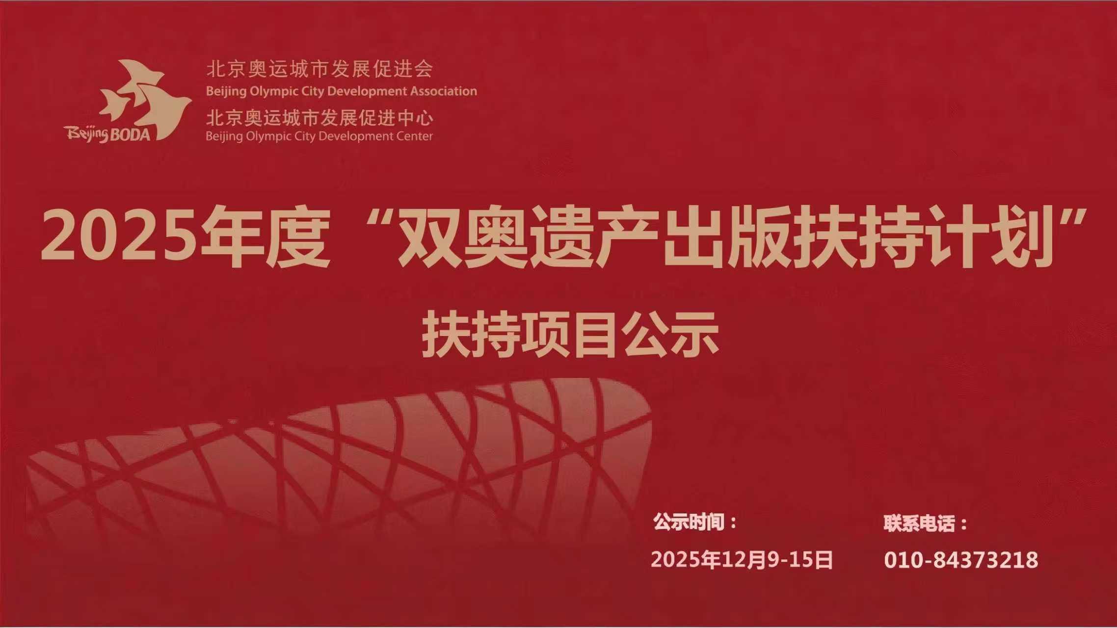 依据《双奥遗产出版扶持计划实施办法(试行)》,北京奥运城市发展促进会秘书处组织开展了2025年度双奥遗产出版扶持项目申报评审工作,共收到出版类项目24件、选题类项目11件。经过评审,确定其中十个出版类和六个选题类扶持项目(名单见附件)。现将结果向社会公示,公示日期:2025年12月9日至12月15日。