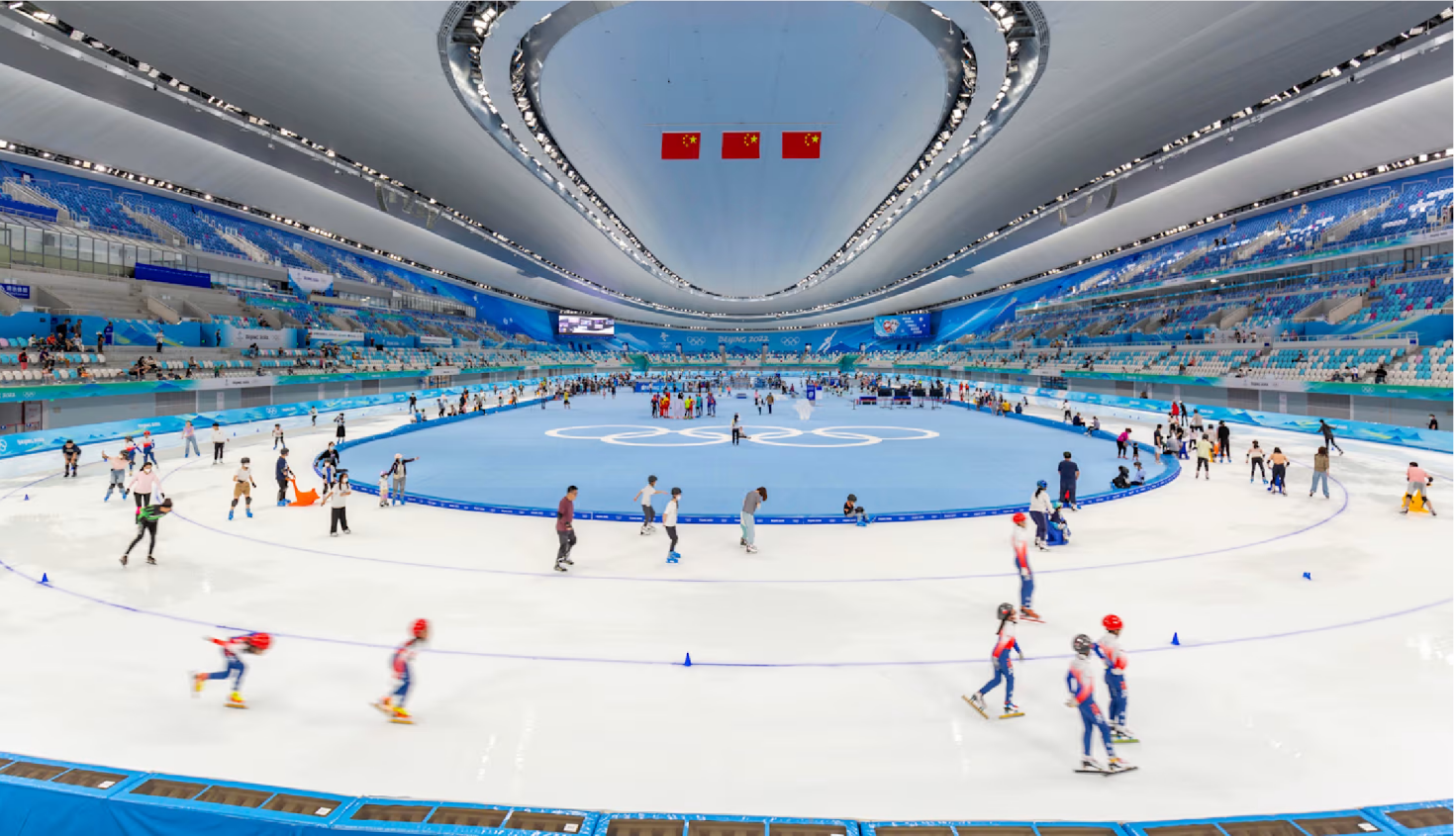绰号“冰丝带”的国家速滑馆,举办各类冰雪运动赛事(包括花样滑冰和冰球)、大众健身活动、文化娱乐活动以及展览。如今已成为国际滑联卓越中心,2025年1月举办了为期七天的短道速滑训练营,助力运动员备战亚洲冬季运动会。该场馆向公众开放,供大众使用,宗旨是在中国推广普及滑冰运动。