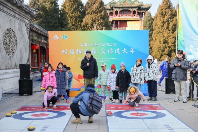 In front of the Summer Palace Museum, lots of children and parents partook in the dryland curling experience competition. Before the competition started, a professional coach explained the basics of curling, including its competition rules. The participating parents and children were all impressed by the unique charm of this sport. They couldn’t wait to practice the moves and techniques of curling, discussing the key points of team coordination in each phase of the competition.