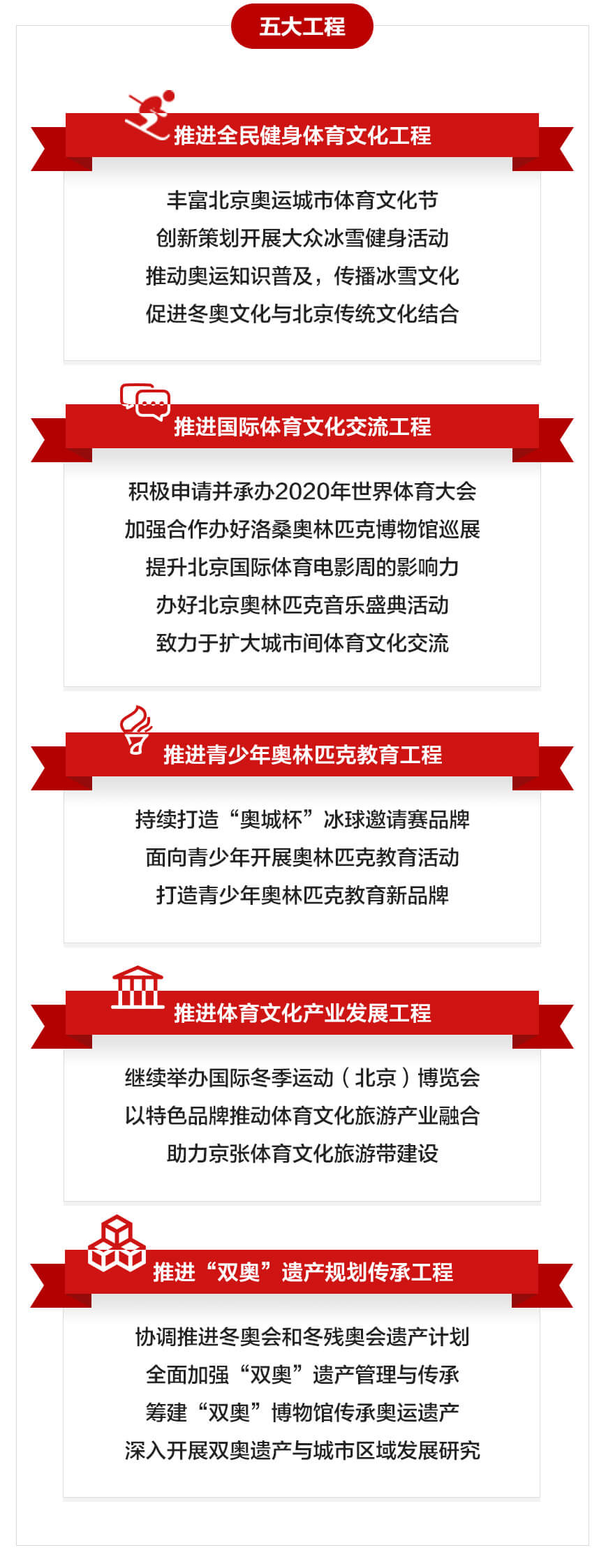 围绕行动主题,重点打造全民健身体育文化、国际体育文化交流、青少年奥林匹克教育、体育文化产业发展、奥运遗产规划传承等5项工程,开展19项重点工作,全面提升既有奥运遗产品牌,创新策划冬奥遗产项目,形成奥运遗产传承事业冬奥会北京周期工作新格局。