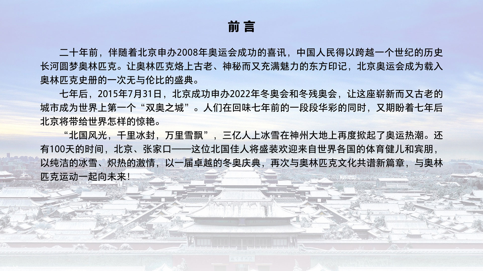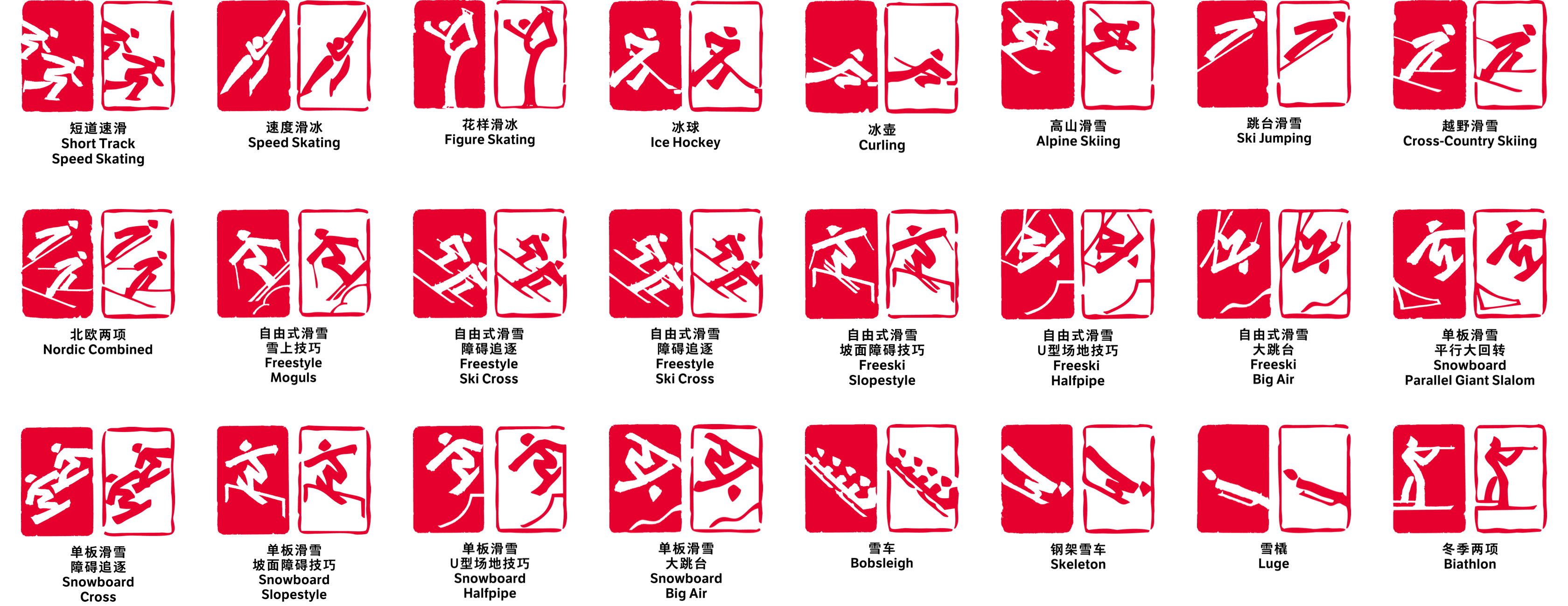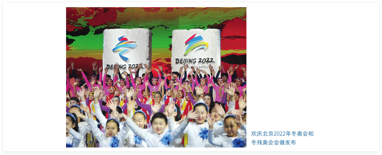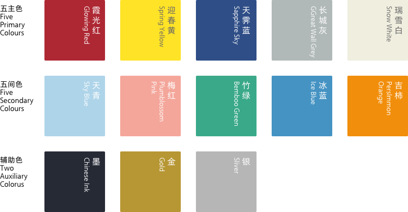 北京2022年冬奥会和冬残奥会色彩系统的主色包括霞光红、迎春黄、天霁蓝、长城灰、瑞雪白;间色包括天青、梅红、竹绿、冰蓝、吉柿;辅助色包括墨、金、银。色彩系统通过基础色系、相邻色系及多色色系等方式可以形成组合应用。