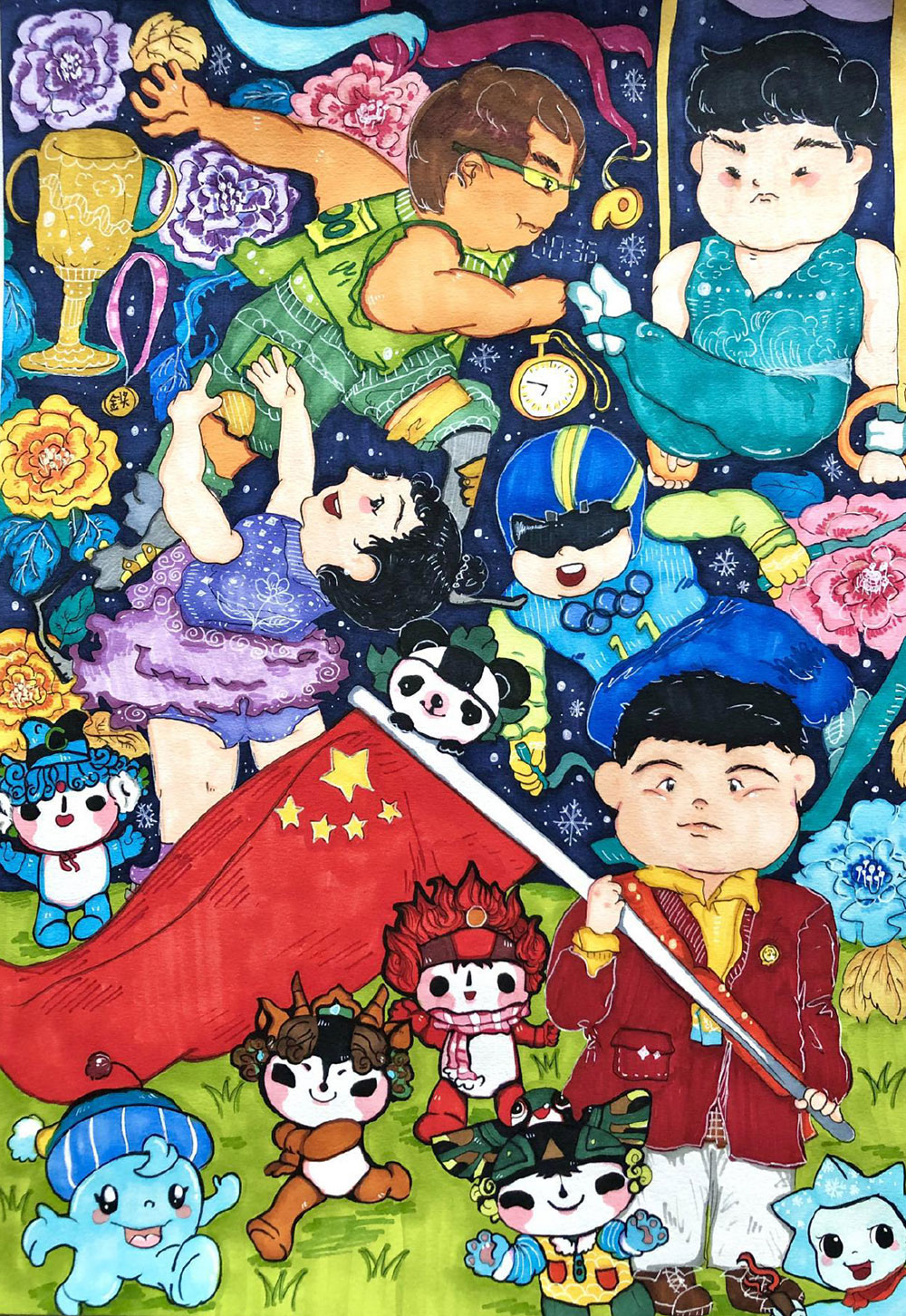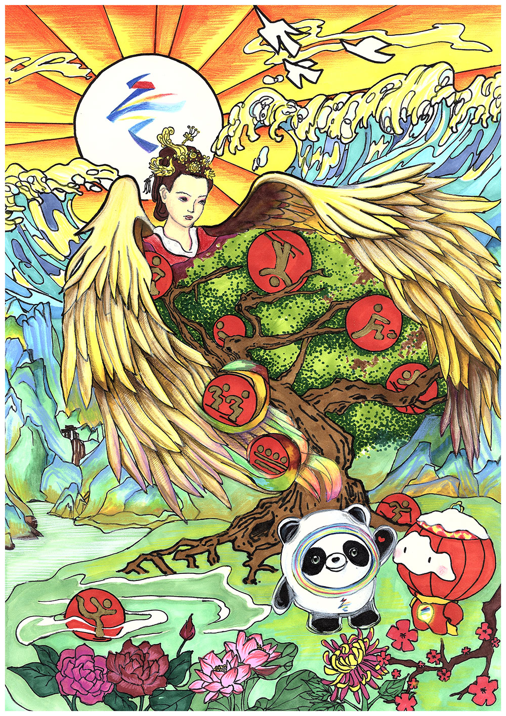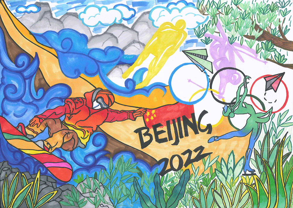 图形整体展现了“绽放的教育之花”,代表着塑造青少年价值观、促进公众参与的重要平台,同时也是让每一个人“发光”、“闪亮”的多彩舞台。寓意北京冬奥会和冬残奥会将通过教育促进公众参与体育运动,让广大青少年感受“卓越、尊重、友谊”的奥林匹克核心价值观和“勇气、毅力、激励、平等”的残奥核心价值观,形成以奋斗为乐、以优秀运动员为榜样。尊重普遍社会伦理的健康生活方式,推动构建更加和谐的社会,不同颜色的花瓣,代表着奥林匹克注意富有强大的生命力。红色花瓣代表热情和活力,象征团结和友谊;橙色花瓣代表时尚,青春,动感;绿色花瓣代表清新,健康,希望,是生命的象征;黄色花瓣代表光亮和辉煌,象征着照亮黑暗的智慧之光;蓝色花瓣代表博大胸怀,永不言弃的精神,和谐世界,象征着五大洲的人民团结在一起。不同形状的花瓣,寓意和而不同,代表着世界不同民族、不同地域文化的独特魅力,代表着文明的多样性,发展模式的多样化。通过奥林匹克教育,促进不同文明间的沟通和对话,增进人与人之间以及国与国之间的相互理解,实现和睦相处,建设人类共同的家园。不同相撞的花瓣也代表没一个不同的个体,寓意通过奥林匹克教育促进人的全面发展。